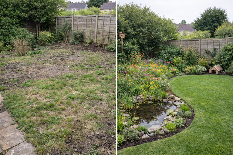 This garden was once bare and lifeless, but it’s now full of colour, movement, and wildlife. With wildflowers, native planting, and a small wildlife pond, the space has been transformed into a garden that supports birds, bees, and hedgehogs, while still staying practical for everyday use.